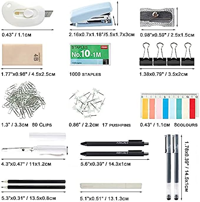 • 【SUPER VALUE SETS】- Office desk accessories set includes 1x Desktop Organizer, 8x Page Markers, 1x Scissor, 2x Ball Pens, 2x Pens, 2x Pencils, 1x Highlighter, 1x Small Cutter, 1x Erasers, 12x Binder Clips, 1x Sharpener, 80x Paper Clip, 17x Clear Push Pins, 1x Stapler, 1000x Staples.