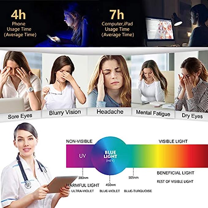 【Blue Light Harms】Visible blue light directly reach retina to harm your eye cells and reduces contrast to increase eye strain. Also, blue light suppressed melatonin to destroy sleep quality.