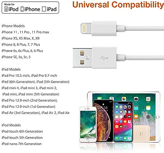 Safe Fast Charging:VODRAIS iPhone charger cable are made of high purity copper core and smart intelligent chip with overcharge protection, stable current protection, automatic switching and battery protection . 2 N 1 Function: Great performance ensures your devices syncs and charge simultaneously with up to 480 mb/s . It syncs photos, music, videos, files with the ability to charge the device. also delivers up to 2.4A current to maximize the charging efficiency performance DURABLE MATERIAL:Highest standard of quality cables at an affordable price, is super smooth and comfortable,more durable than standard Phone charger cord. Quality Copper Wire: Connects to your iPhone, iPad with Connector charges/syncs by connecting the USB connector into wall charger or computer. Enjoy charge times up faster than than most standard cables Universal Compatibility: Work with iPhone 13 12 11, 13 12 11 Pro, 13 12 11 Pro Max,13 12 Mini, XS Max, XS, XR, X, 8 Plus, 8, 7 Plus, 7, 6S Plus, 6S, 6 Plus, 6, 5S, 5C, 5, iPad Pro, iPad Air, Air 2, iPad mini, mini 2, mini 4, iPad 4th gen ,iPod Touch 5th gen, iPod nano 7th gen and Beats Pill+ Ultra High Quality Assurance: According to the experimental results, the fishbone design can accept at least 20,000 bending and insertion tests for extra protection and durability. Upgraded 3D aluminum connector and exclusive laser welding technology, which to ensure the metal part won't break and also have a tighter connection which fits well even with a protective case on and will never loose connection.