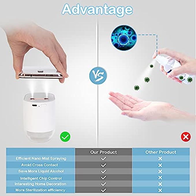 ✔️Portable & Widely Use : Leak-proof and lightweight design, portable sterilizer and mist disinfectant sprayer. Automatic induction spray, safe and ample misting without disturbing children and adults. It can be carried in your bag and used anywhere. Suitable for cleaning hands, cell phones, glasses, keys, pens or remote controls.