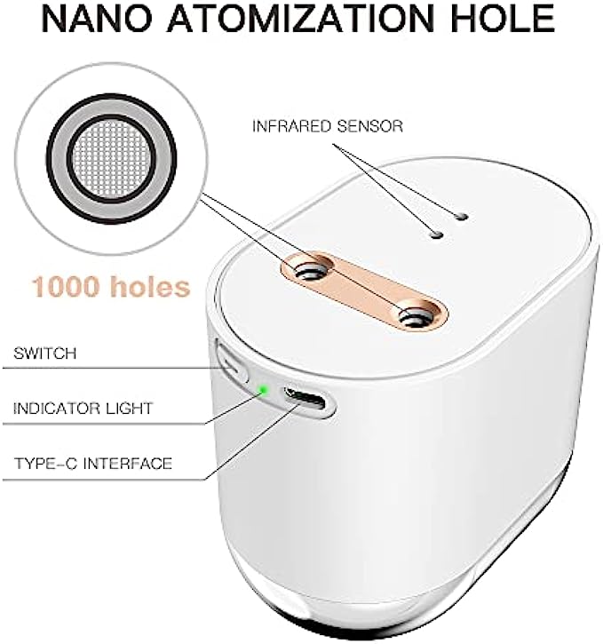 ?Ultra-sonic Atomization Technology : Touchless two hands sanitizing device, sanitizing mist sprayer, microporous atomization. Sanitizer spray for restaurants, car hand sanitizer dispenser, silent and moisturizing. The sanitizer can evenly apply to all surfaces of hands or cell phones, helping families effectively avoid cross infection.