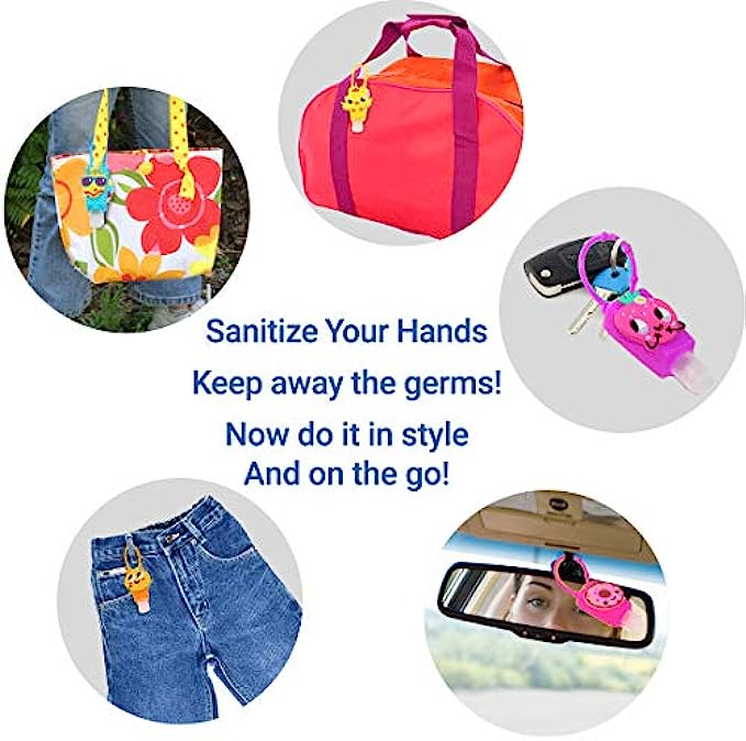 • ✅ 8 PACK reusable hand sanitizer/lotion key ring silicone cases and easy to fill 1 Oz. empty bottles. Multiple colorful design packs to choose from to put a smile on any child face!
