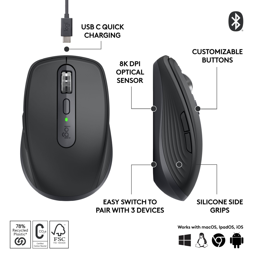 Logitech MX Anywhere 3S Wireless Bluetooth Silent Mouse, Long Battery Life, Multi OS, Trakc Anywhere, Quick Charge