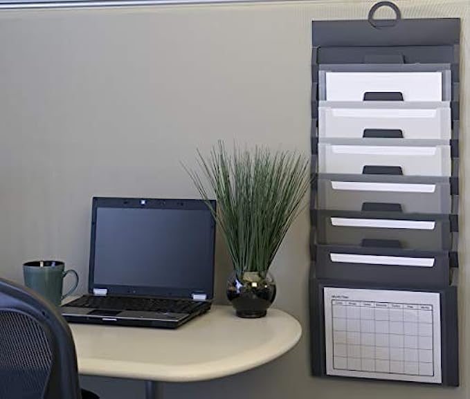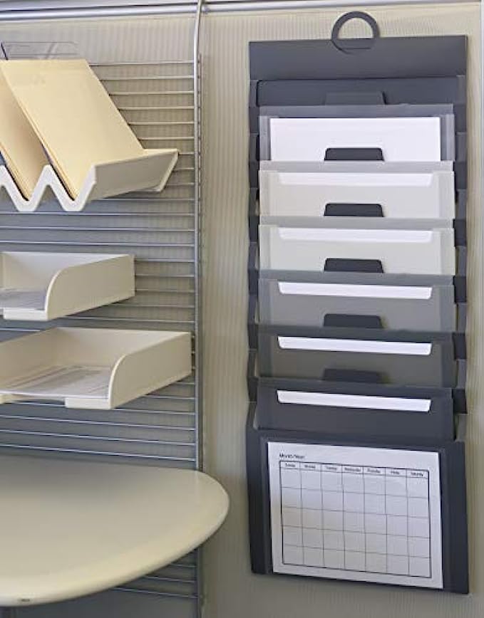 Includes 1 letter size hanging wall organizer (14-1/4" W x 36-1/4" H when open) with 6 removable file folder pockets in neutral colors, 1 clear front pocket and 1 blank label sheet