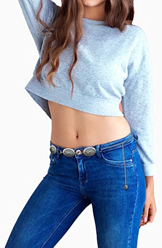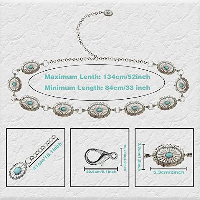 60%silver 40%turquoise Imported Snap closure Clean with damp cloth Fashion Style: Turquoise flower style, silver-plated chain, more beautiful and fashionable, the surface adopts more exquisite craftsmanship to make it smoother and brighter, inlaid with fashionable turquoise, beautiful and generous, it will show your personality and temperament and inspire others to love you. Material and Size: The western belt for women is mainly made of high quality metal and faux turquoise material, strong and durable, not easy to fade or break, the belt is about 134cm/52.7 inches in length, weighs about 170g/6oz, lightweight and comfortable to wear, metal shell Length 5.3cm/2 inches, width 3.8cm/1.5inch, suitable for most people to wear. Easy to Wear: The cowboy belt is designed with a lobster buckle, can be adjusted according to your needs, the shortest is 84cm/33 inches, the longest is 130cm/52 inches, just change the position of the hook to adjust the tight fit according to your preference degree, you can show your slender waist, beautiful and charming.