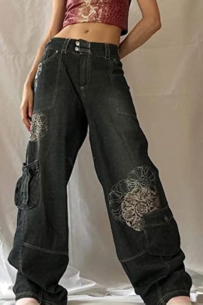 Y2K Baggy Jeans Women Graphic Print Wide Leg Straight Pants Vintage Denim Cargo High Waist Trousers E-Girl Streetwear
