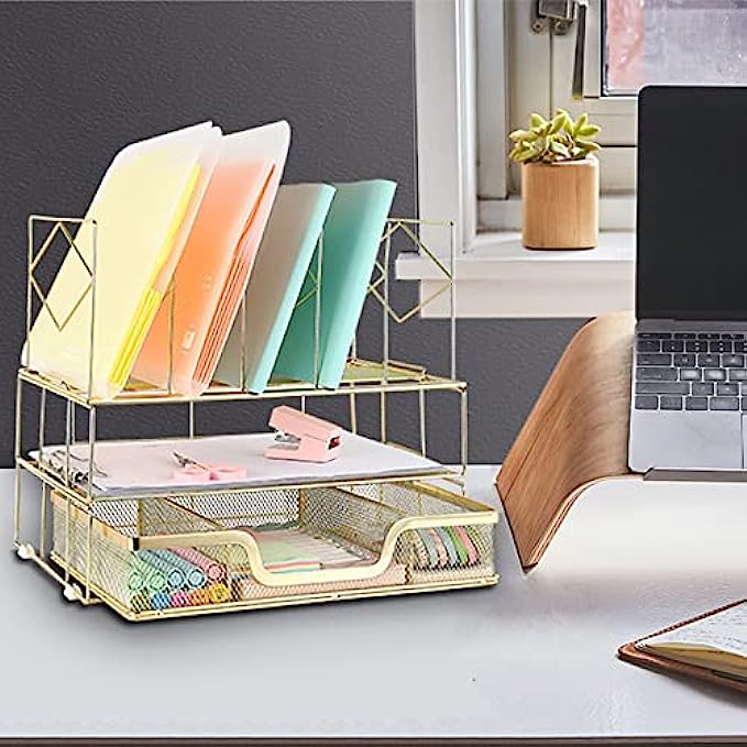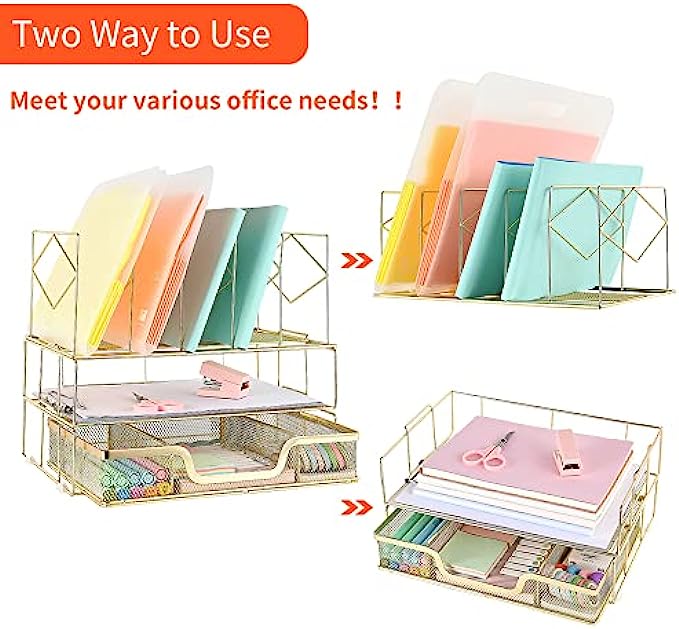 【Space Saving】The double tray with sliding drawer and vertical sorters provide everything you need and makes the most of your vertical and horizontal space. Keep your desk looking tidy at all times.