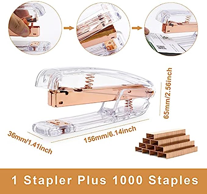 • 【Package Include】1x rose gold stapler + 1x rose gold Staple Remover+ 1000x Staples+ 12x Binder Clips+ 1xTape Dispenser+ 3x Cute Transparent Tape + 1x Pen+ 1x Pencil Cup.