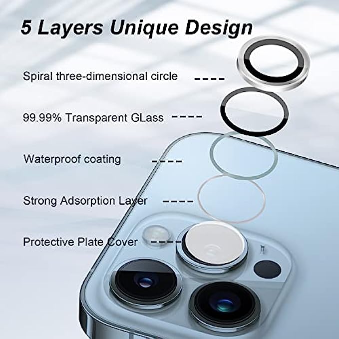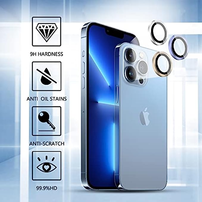 • [Alloy Material] Our camera lens screen protector 13 pro max is made by premium aviation aluminum and 9H tempered glass.The lens protector is only 0.03mm thickness,Precision cutting of alloy materials and tempered glass perfectly compatible with iPhone 13/iPhone 13 Pro Max camera lens.