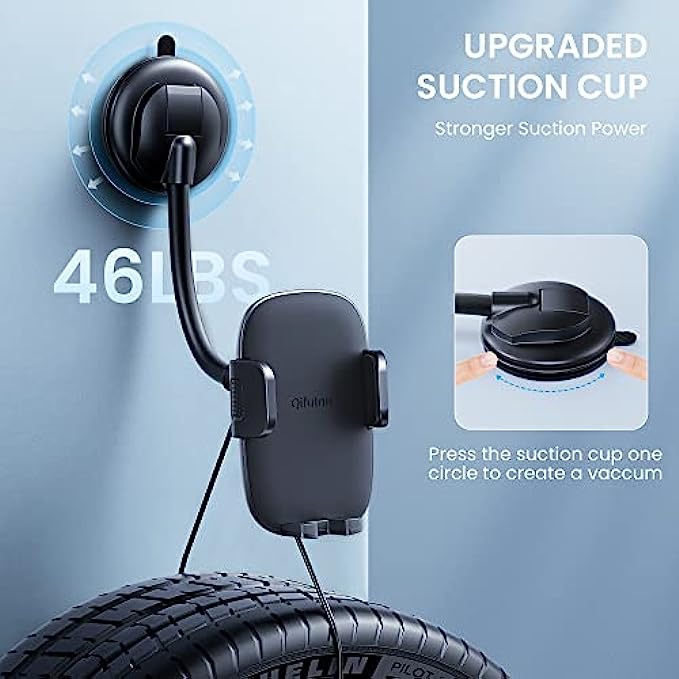 • Secure Steady Installation: Qifutan car mount for iphone 13/12/11 features an extra-strong vacuum suction cup with a layer of super sticky gel, a locking lever, and an anti-shake stabilizer. It sticks securely and easily on the windshield or most flat surfaces and removes the phone car mount without leaving any nasty marks. (Note: use warm water to wash the car holder's suction cup if the surface is dirty or it can not stick firmly, then let it air dry.)