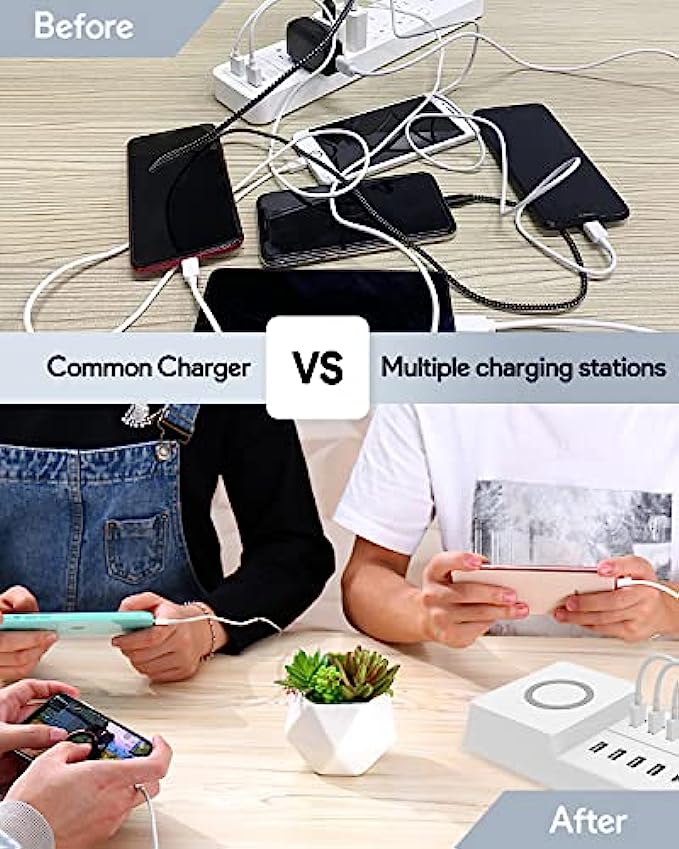• Neat and organized - The phone charging station can charge up to 11 devices in one place at the same time, eliminating the need to plug countless chargers into power sockets or spread devices across the desk, keeping your desk clean and clutter free from cluttered cables.