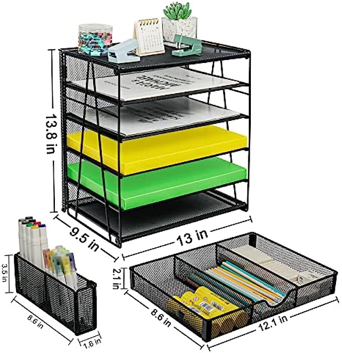 • 【Super Large Capacity】5 tier desk organizers and storage is ideal for your office, it has enough storage space for all your desk supplies can sort your files, paper, which is very convenient for you to find the files you need. This Letter tray design hanging pencil holder (with built-in hooks) has two to organize all your pens and pencils, and the sliding drawer can be placed at will and provides great space for your desktop.