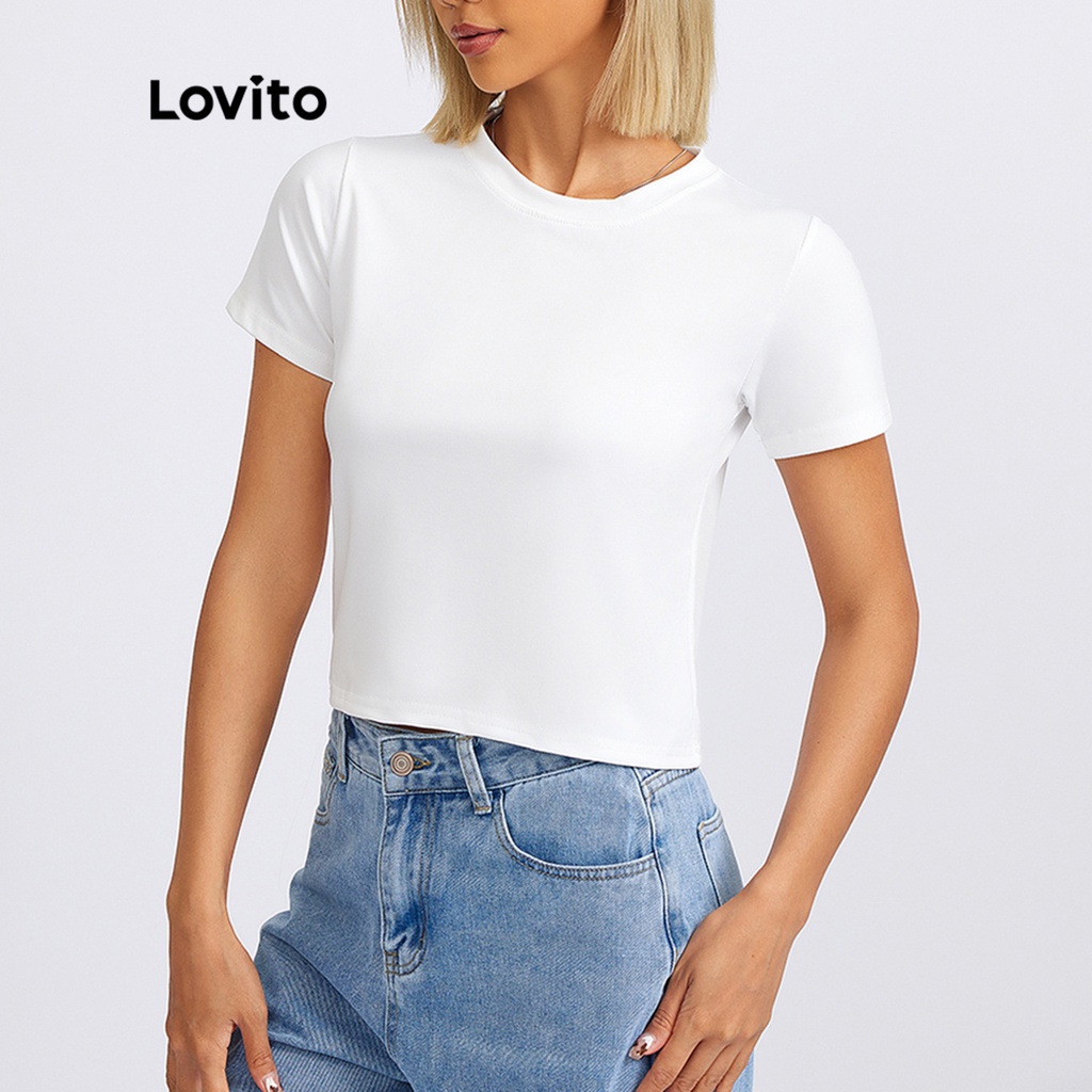 Lovito Casual Plain Crew Neck Basic Tshirt for Woman L18X101 (White/Pink/Blue/Black)