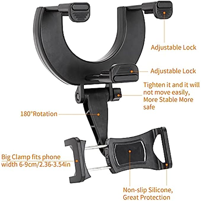 • Stable Car Phone Mount: it grips your mirror firmly and phone mount grips your phone firmly even on bumpy roads,The non-slip silicone rubber on holder increases the clamping power & protects rear view mirrors and your phone from scratches