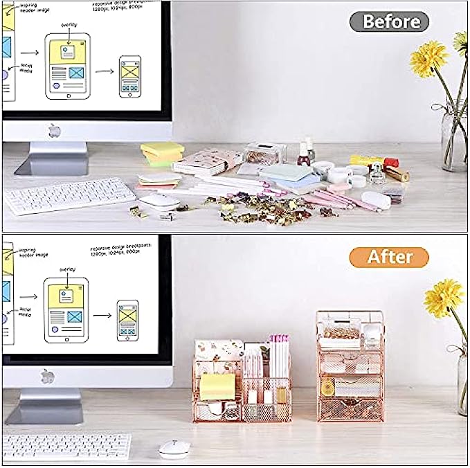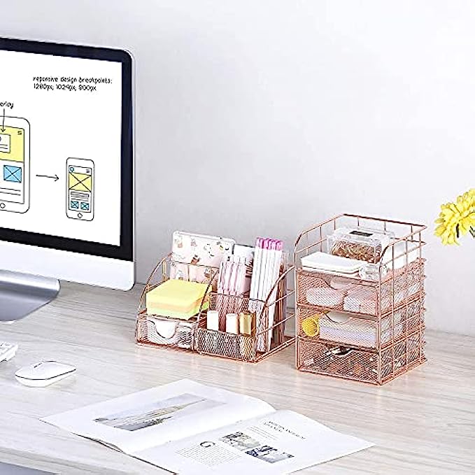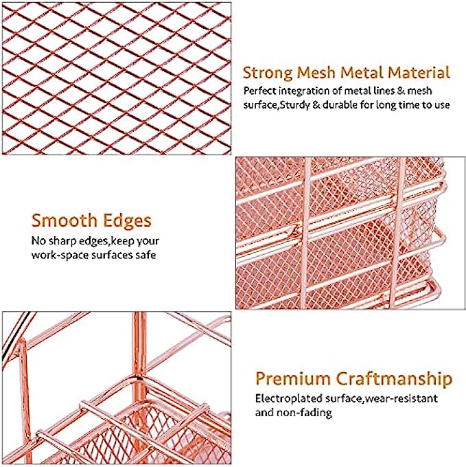 【UNIQUE & STYLISH DESK DECOR】The perfect combination of wire mesh and rose gold,with smooth rounded edges,which presents an elegant appearance and greatly makes a balance between performance and beauty.The dazzling color will bring you a relax and comfortable feeling during the busy working time,even improve your work efficiency.