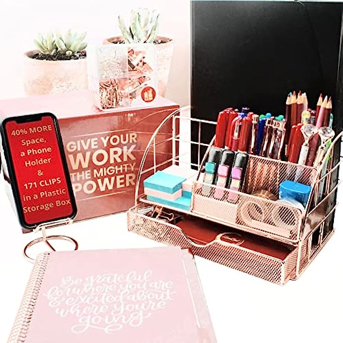 THE MOST COMPREHENSIVE DESK ORGANIZER SET: 40% Larger Rose Gold Desk Organizer paired w/ BONUS 171 Clips Set: 6 Pcs Large Binder Clips, 15 Pcs Small Binder Clips, 100 Pcs Paper Clips, 50 Pcs Push Pins; Stored in a reusable clear acrylic box to keep these clips accessible and organized; Also, an Ergonomic Design Phone Holder provides a perfect viewing angle with an extra-large base; All packed in an elegantly designed gift box; A perfect gift idea to anyone who works in an office and home!