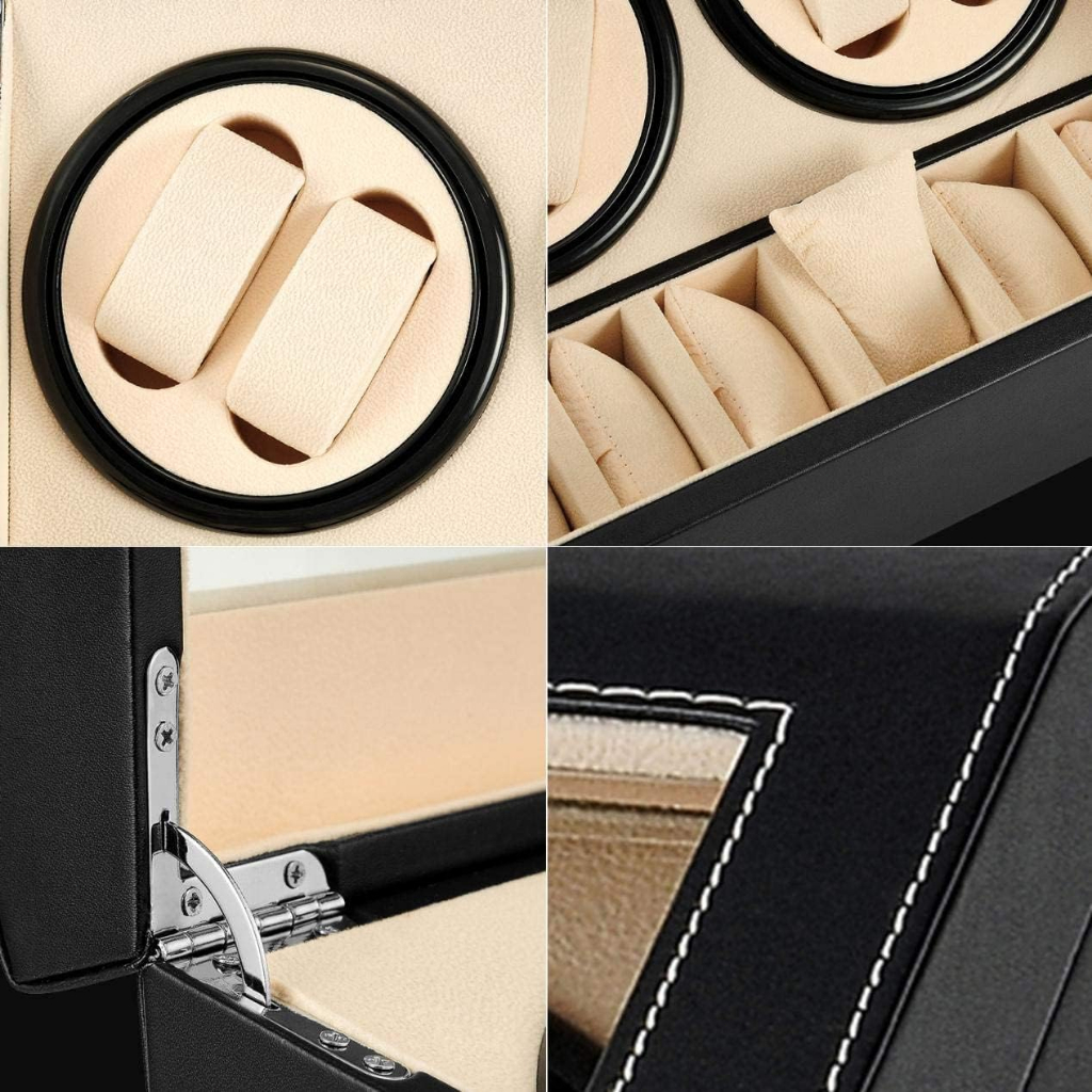 I like that I no longer have to set my automatic watches, and have additional space for my battery operated watches. The auto wined feature is very silent and seems to spins randomly throughout the day. It has 4 space for automatic watches and six adjustable slots for battery operated watches (which can be used for other accessories)