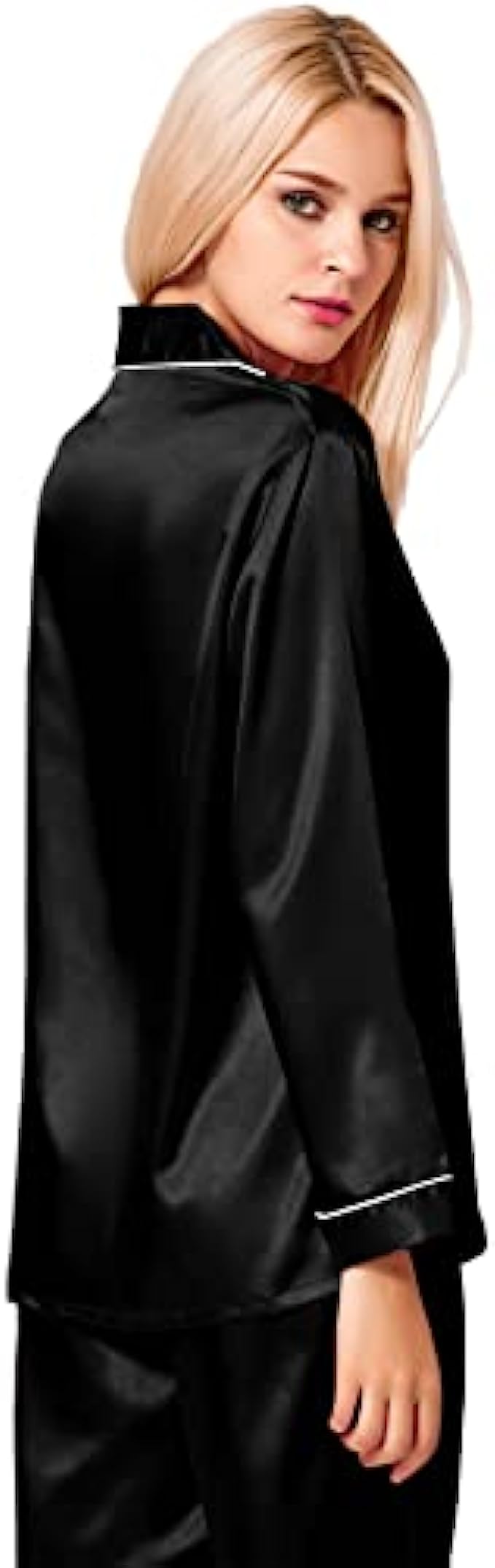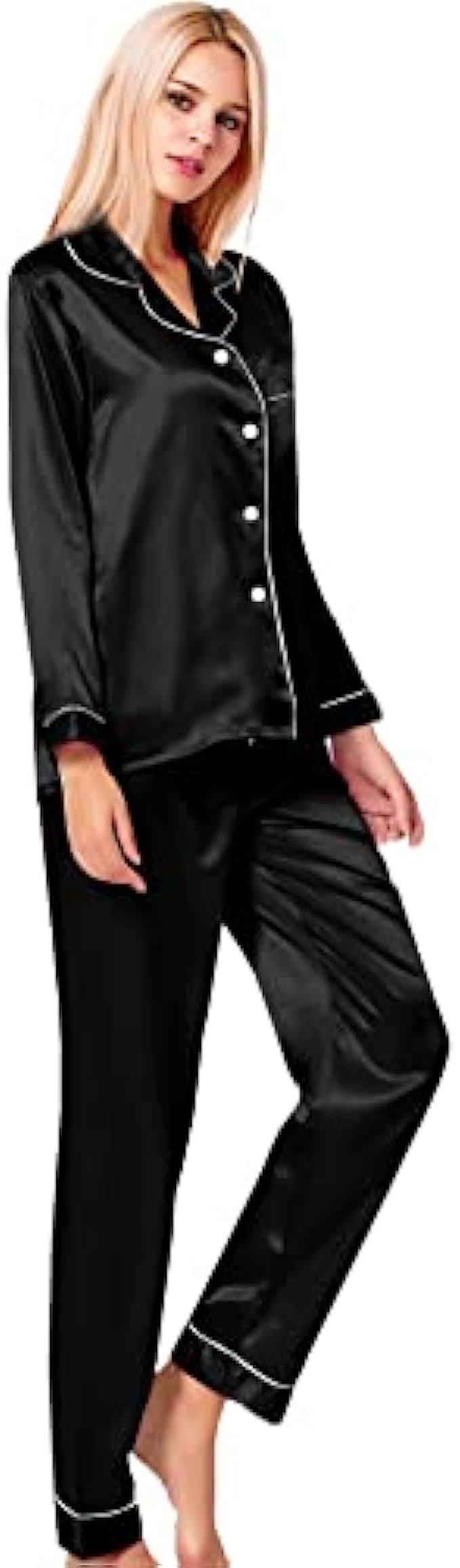 Button closure Machine Wash Materials: This lightweight pajama set is made of lightweigh silk satin, soft,breathable and skin-friendly, help you have a sound sleep. Features: The relaxed fit two-piece comfortable sleepwear pajama set features the silkiest pant with elastic waist and matches a silky-smooth long-sleeve V-neck top with a chest pocket, notch collar and the button-front top hits at hips. The sleepwear set are soft and elegant, to giving you a lazy sleep. Occasion: Women's Long Sleeve Silk Satin Pajamas Set, which is suitable for daily wearing and easy to match. Comfortable and suitable for lounging and sleeping, pajama party, girls day, bridal sleepwear, indoor, living room, bedroom, hotel, vacation, travel, and daily sleepwear. Gift: Women's silk pajamas for women is made of high quality imitation silk fabric, it is soft and natural shiny. Great Choice For your Wife, Girlfriend, Mother, Sister and Doughter as a Birthday gift and Great Present for New Year, Valentine's Day, Christmas Day, Bridal Party Gifts, Honeymoon Vacation or other Festivals or Anniversaries. Washing Tips: Machine Washable, Hand Washed Suggestion.