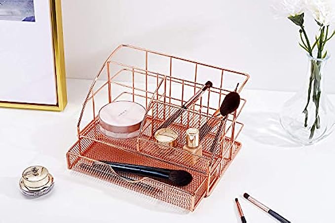 【SHINY & STURDY CONSTRUCTION】:Adopting premium electroplating technology to make the construction of desk organizer much sturdier and reliable.what's more,rose metal finish design show the appearance more elegant and durable use than other mesh or plastic organizer.