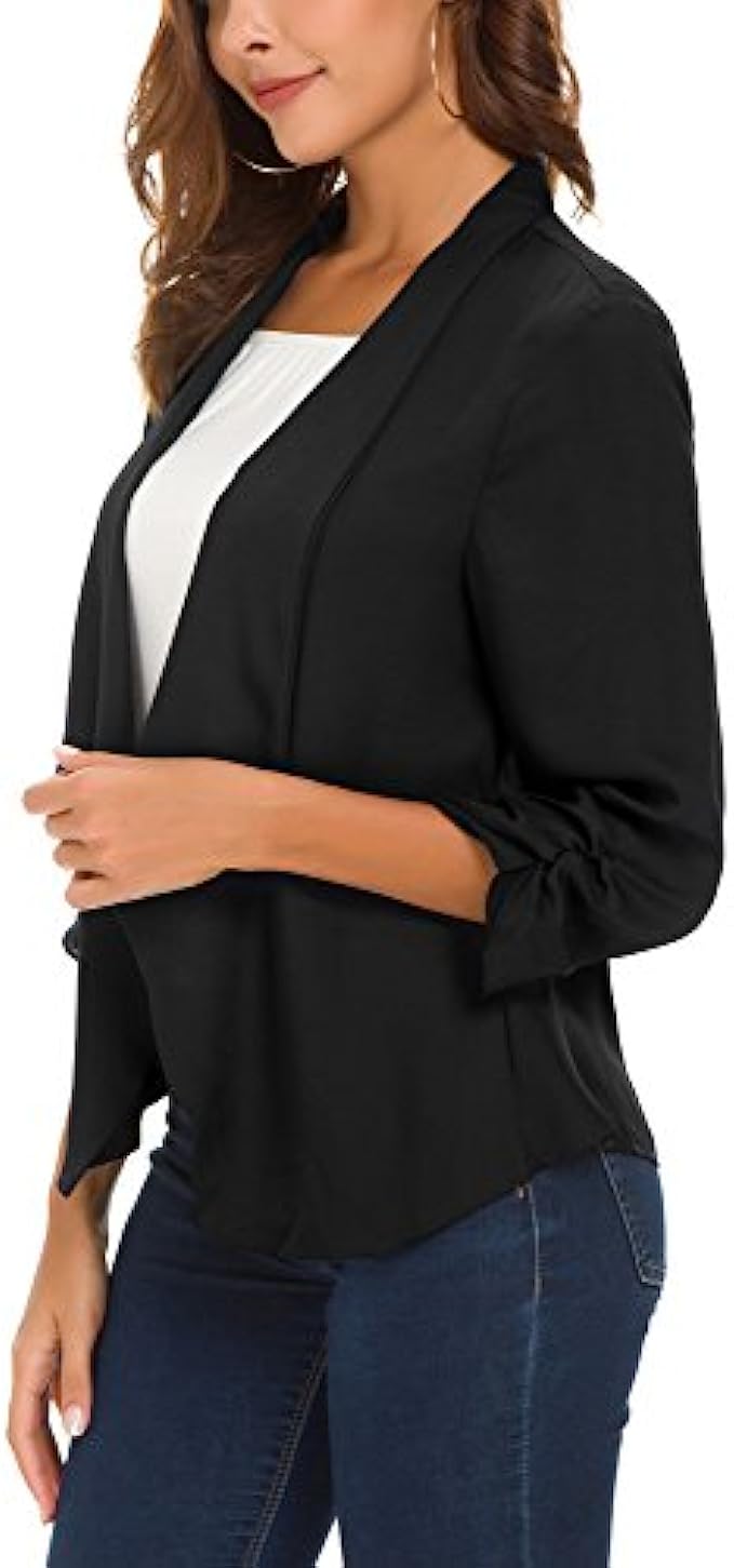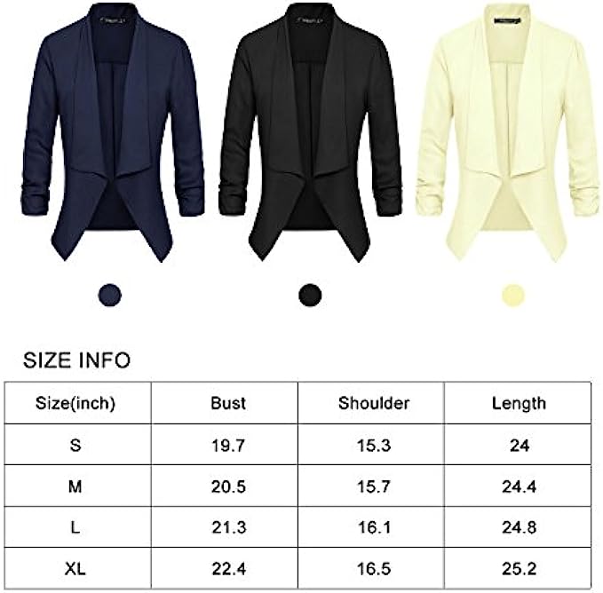 • Features 3/4 ruched sleeve blazer, open front, no padded shoulder,uneven vented hem,and notched collar